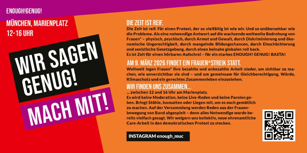 Am 9. März lassen Frauen* weltweit bezahlte und unbezahlte Arbeit ruhen und zeigen damit, dass sie GENUG! haben. Die Zeit ist reif für einen Protest, der so vielfältig ist wie…